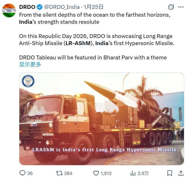中国青年报客户端北京1月27日电 (中青报·中青网记者 张昊天)1月26日,印度为庆祝“共和国日”举行大规模阅兵。在新德里街头亮相的众多武器系统中,最受关注的是一款代号LR-AshM的高超音速导弹。外界认为,这款武器的亮相标志着这个南亚军事大国正式加入“高超音速武器俱乐部”,缩短了与“头部玩家”的差距。